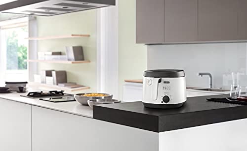 De’Longhi Fritteuse FS3021, 1800 Watt, Weiß und Schwarz – Frittieren Sie köstliche Speisen abgehärtet über dieser De’Longhi Fritteuse über Cool-Schleier-Wänden. Ein modernes Design, das die traditionelle Fritteuse verwandelt! Die Innovation von De’Longhi, die Fritteusenplattform FS30, bietet ein kleines Format und ein Fassungsvermögen von 2L Öl, um 1kg frische Pommes Frites in einer Charge zuzubereiten, ideal sondern Paare. Ein Kontrollfenster ermöglicht es Ihnen, den Vorgehen des Garvorgangs immer wieder zu überprüfen. Ein verstellbarer Thermostatknopf von 150° bis 190°C ermöglicht es Ihnen, die Temperatur des Öls je nach den verschiedenen Zubereitungen, die Sie kreieren, anzupassen: Pommes Frites, Krapfen, Knödel, Fisch, Gemüse. Box Enthält: 1 x De’Longhi Friteuse FS3021