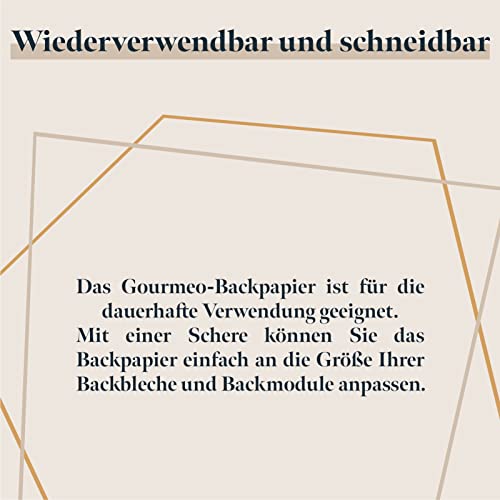 WIEDERVERWENDBAR & ZUSCHNEIDBAR – Du kannst das GOURMEO Backpapier merhmals im Backofen angleichen. Mit einer Schere kann man das Backpapier diffizil an die Backbleche und Backformen adaptieren.