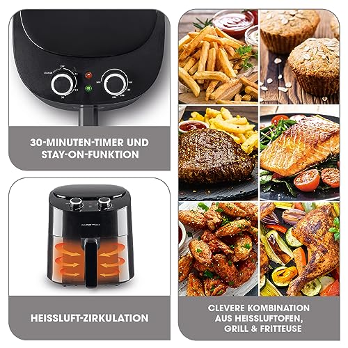 MULTIFUNKTIONALES KÜCHENGERÄT – Kombiniert Heißluftofen, Grill und Fritteuse für vielseitige Zubereitungsoptionen. Perfekt geeignet zum Frittieren, Grillen, Braten, Backen, Rösten, Erhitzen, Warmhalten und Auftauen.