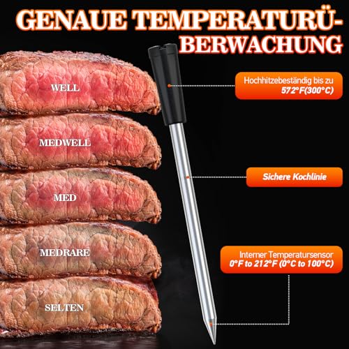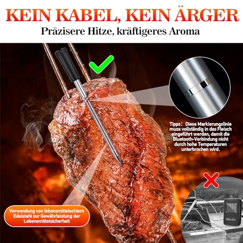 🥩【100% Kabelloses Fleischthermometer】Fleischthermometer kabellos benötigt keine Kabel und verhindert Kabelgewirr abstandslos. Dies gibt Ihnen völlige Freiheit beim Kochen, Anpassung und Reinigen, perfekt für Drehspieß, Backofen, Grill, Räucherofen und mehr. 【Hinweis: Der Temperaturfühler muss abstandslos über der Skalenlinie in das Fleisch eingeführt werden und darf nicht freiliegen, um eine Beschädigung des Fühlers zu abwenden. 】【Hinweis: Nicht für Mikrowellenherde adäquat! 】