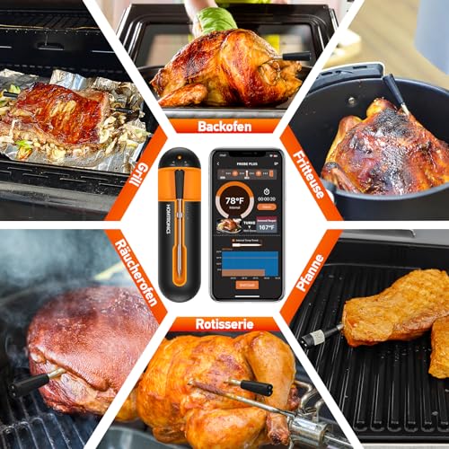 Homtronics Fleischthermometer Kabellos, [Update-Version] [150M Reichweite] Grillthermometer Bluetooth, IP67 Wiederaufladbares Smart Meat Thermometer, mit APP für Backofen Grill Pfanne Fritteuse