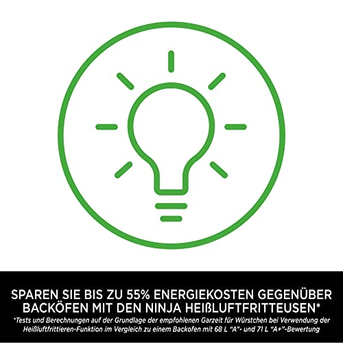SPAREN SIE BIS ZU 55% Energiekosten gegenüber Backöfen mit Ninja Heißluftfritteusen* (*Tests & Berechnungen auf Grundlage der empfohlenen Garzeit für Würstchen bei Verwenden der Heißluftfrittieren-Funktion im Vergleich zu zwei repräsentativen Öfen)